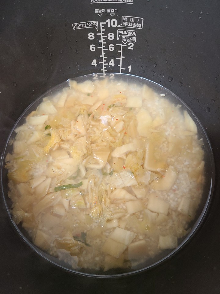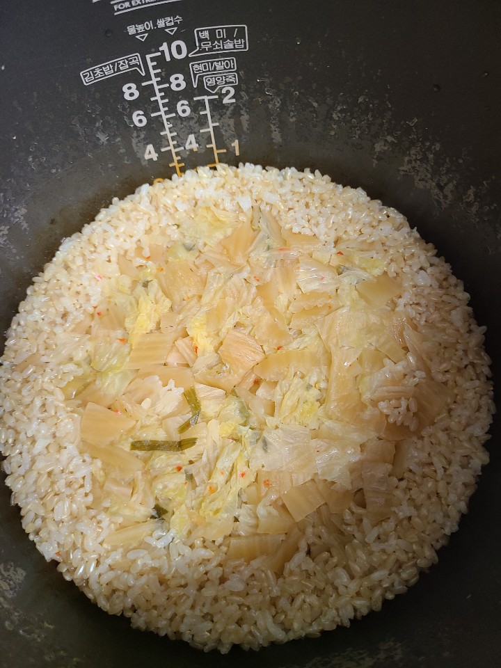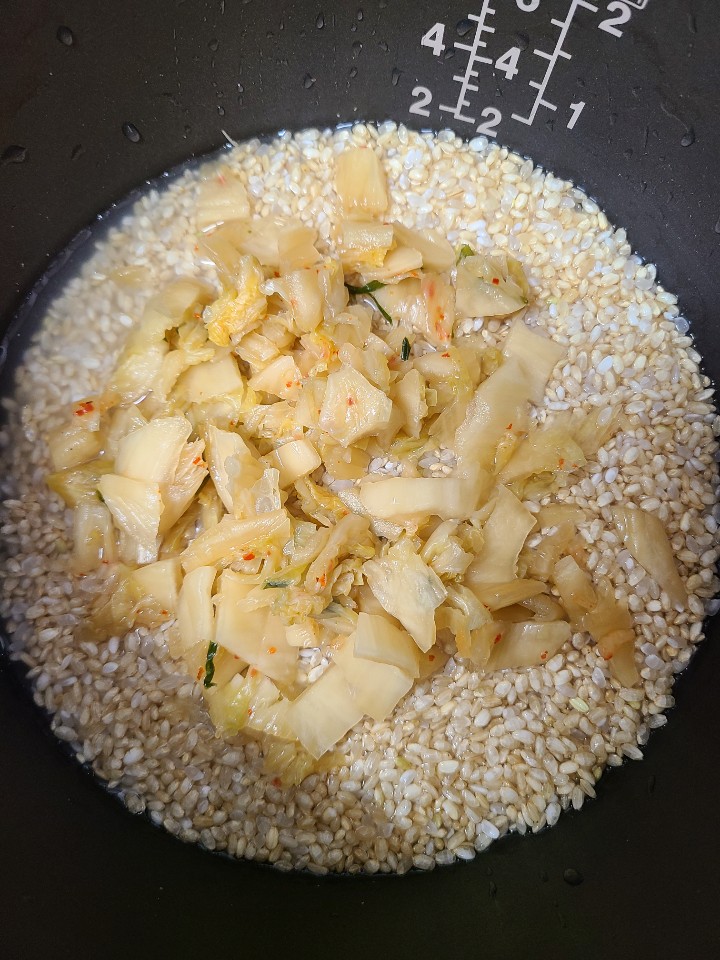 이처럼 준비해둔 쌀, 김치 위로 콩나물 끓인 물로 밥물을 맞춰줍니다.
