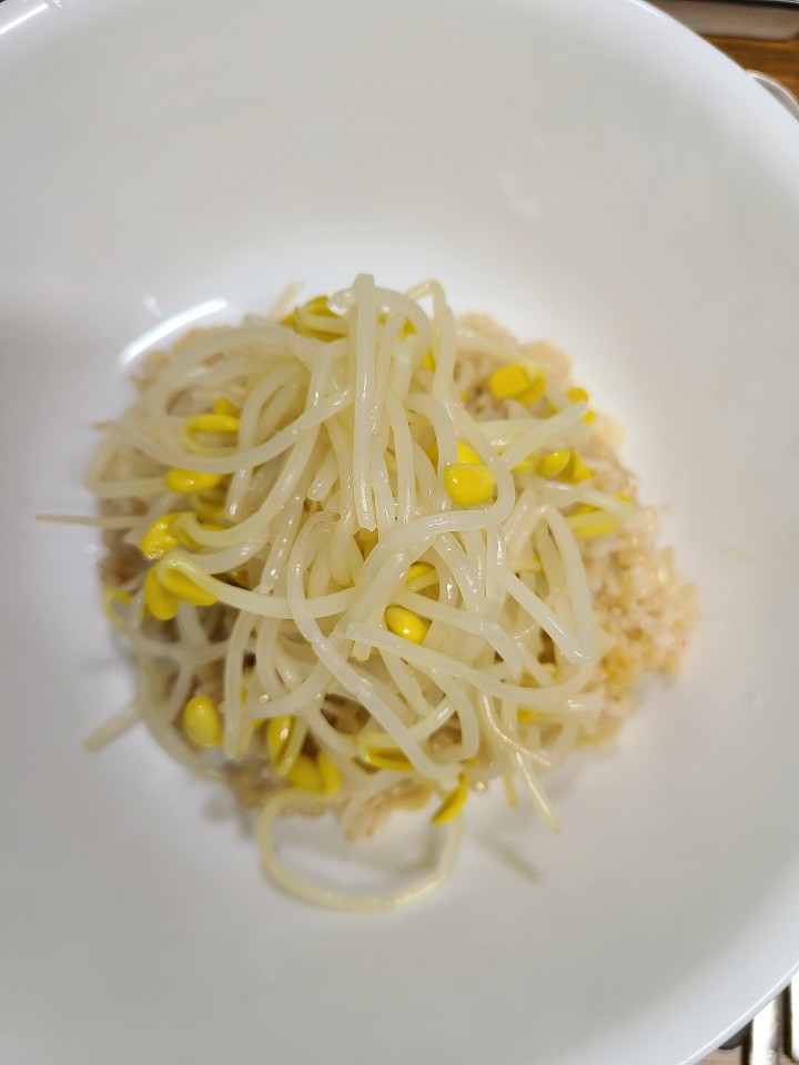 이제 이 위에 콩나물을 얹어줄겁니다. 미리 살짝 데쳐놔서 아삭한 콩나물이에요.