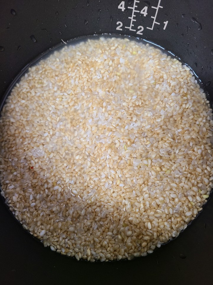 깨끗이 씻은 현미와 흰쌀이에요. 밥 물은 그냥 물이 아닌, 콩나물을 삶은 물로 할거라 이대로 씻어 준비했습니다.