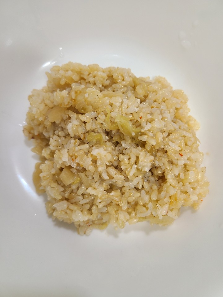 현미쌀밥과 김치 그리고 콩나물 삶은 물로 완성된 밥이에요.
