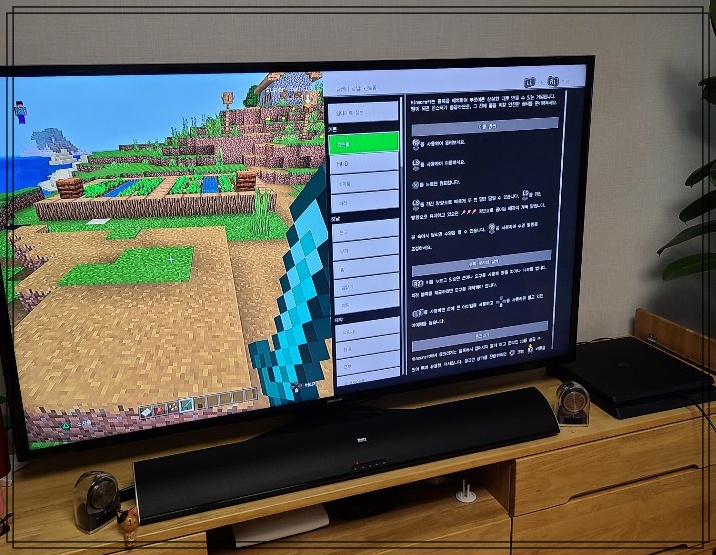 우리도 좀 해볼까~? 하고 아빠엄마도 게임기 앞에 앉아봤어요. 마인크래프트는 재미없어보여서 저희는 낵을 했는데...