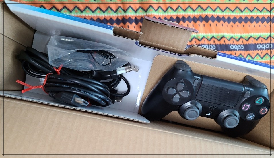 중고지만, 깨끗한 상자에 곱게 들어있어요. 상자를 열면 검정색 듀얼쇼크 패드 1, 각종 연결 선들, 그리고 본체가 들어있어요. 모두 정비를 잘 해놨다는 생각이 들었어요.