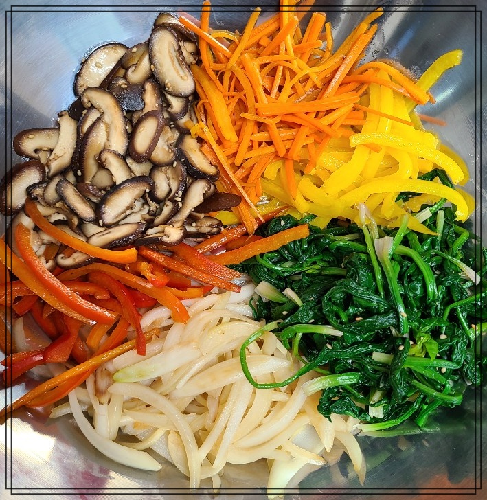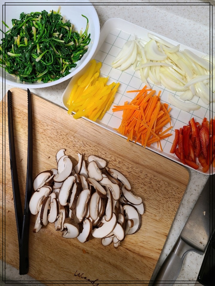 당면, 표고버섯, 시금치, 노랑.빨강 파프리카, 당근, 양파