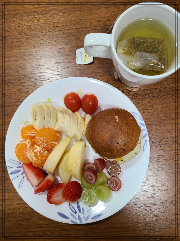 오늘 아침식사는, 과일과함께 감자샐러드를 품은 모닝빵 그리고 카모마일 차와 함께 했어요.