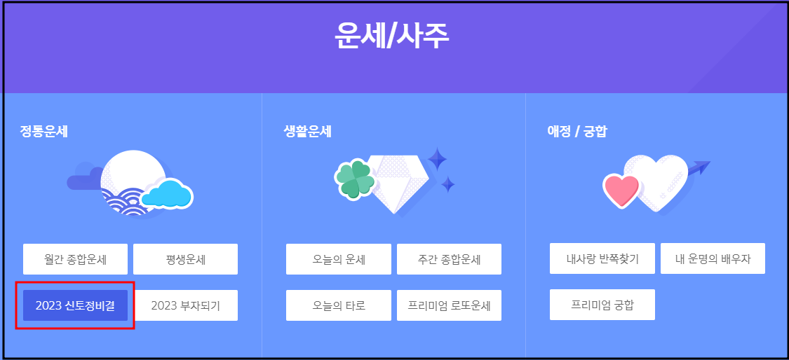 많은 분들이 이용하시는 사이트입니다. [2023 신토정비결] 메뉴를 통해 내 사주 풀이, 재물운, 사업운, 직장운, 건강운, 대인관계 등의 운을 확인해보세요.