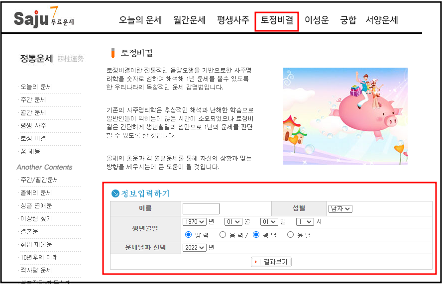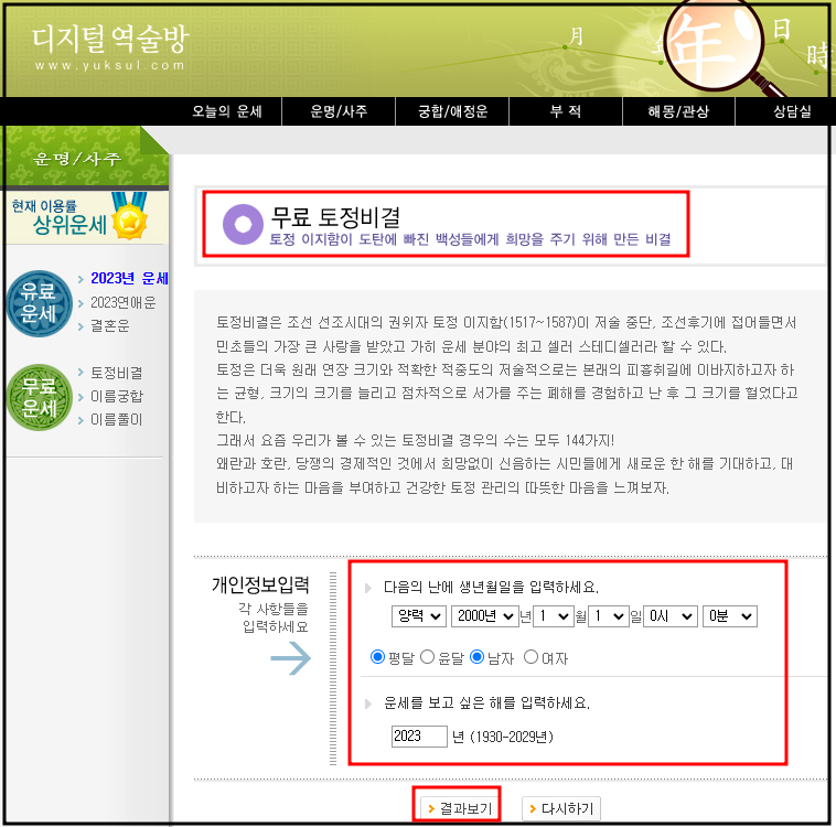 [사주7 사이트에 접속 > 토정비결]에 들어가 이름/ 성별/ 생년월일을 입력하고 운세를 보시면 됩니다.