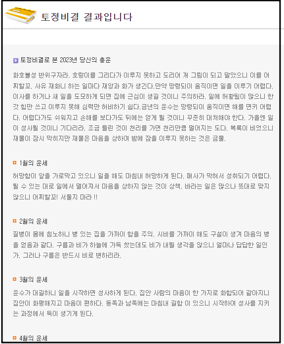 2023년 토정비결 결과과 아래 이미지처럼 나오게됩니다.