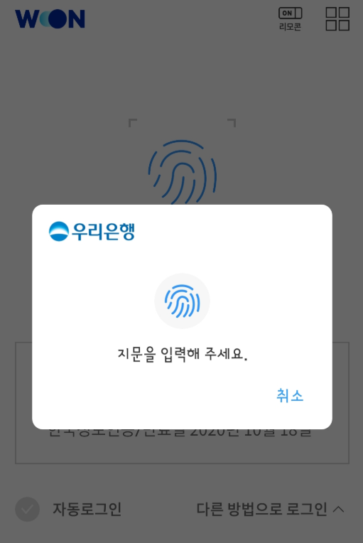 1. 먼저, 모바일 앱 WON뱅킹에 로그인해줍니다. 저는 지문으로 로그인 방식을 설정해놨습니다.