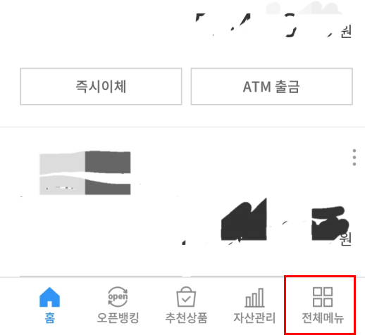 2. 로그인하면, 자신의 계좌별 잔액이 화면에 나오게됩니다. 그럼 오른쪽 제일 아래에 있는 '전체메뉴'를 터치해주면 됩니다.