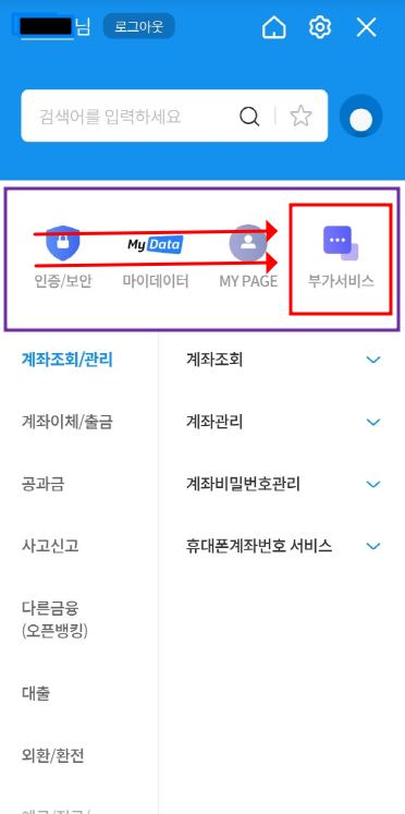 3. 전체메뉴로 들어가면 화면이 바뀌며 상단에 아이콘들이 보입니다. 이 아이콘을 옆으로 밀면 끝에 [부가서비스]메뉴가 나옵니다.