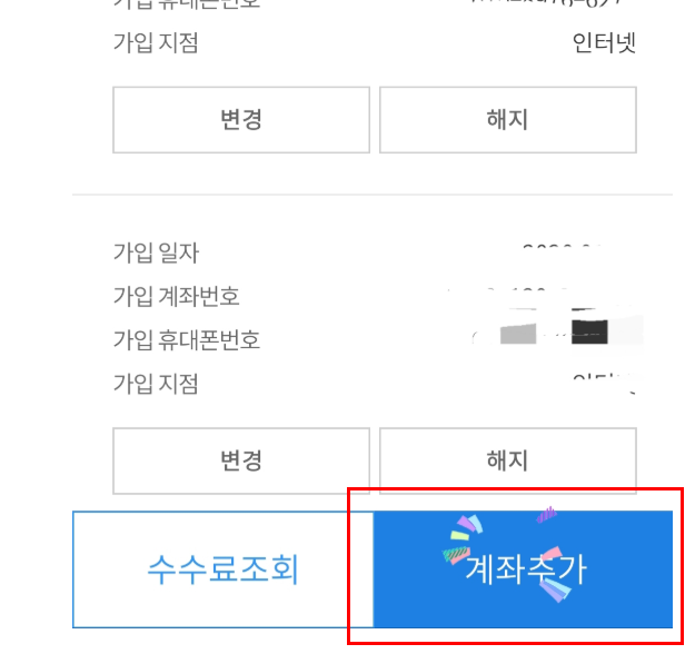5. SMS입출금통지 서비스. 이 메뉴에 들어가면 기존에 등록되어있는 목록들이 나옵니다. 그리고, 통지서비스를 추가하기 위해서 '계좌추가'를 터치해 이동해줍니다.