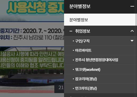 [취업정보] 하위 메뉴로 구인/구직, 아르바이트 뿐만아니라 진주시 청년면접정장대여사업 까지 다양한 정보를 얻을 수 있습니다.