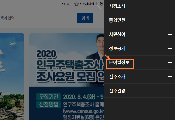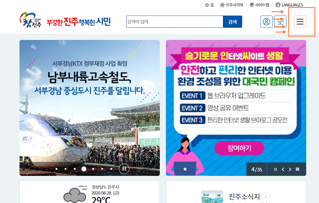 진주시청 사이트에 들어가면 많은 공지들이 뜹니다. 그 중 메인 화면 오측 끝에 있는 메뉴를 클릭합니다.