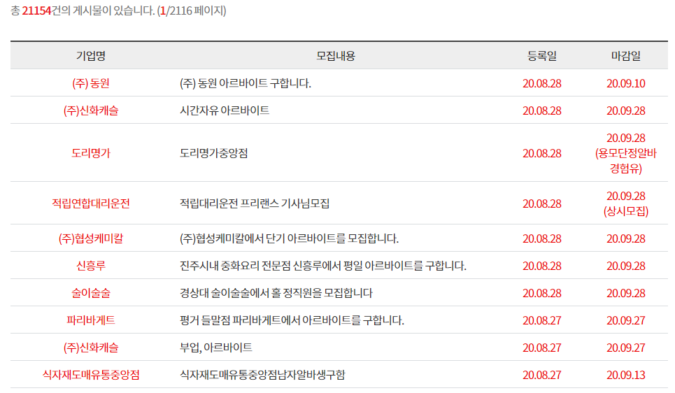 아르바이트를 구하는 기업명, 모집내용, 등록일, 마감일 모두 꼼꼼히 잘 살펴본 후, 아르바이트를 구하면 되게 해놓았습니다.
