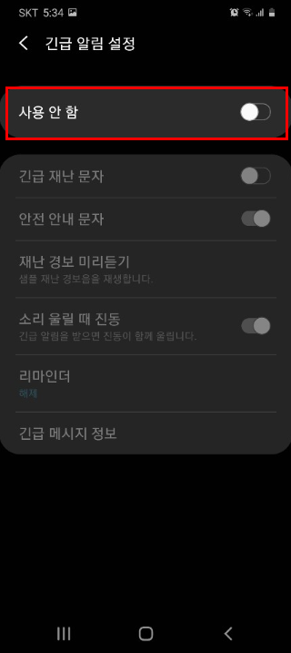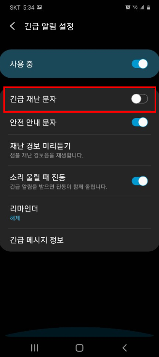 긴급 재난 문자 알림을 끄고 싶을 땐, 빨간 박스 안 긴급재난문자 on/off스위치를 클릭해 사용안함으로 변경해주면 됩니다. 위 사진과 같이 파란색 on스위치가 꺼지는 것을 볼 수 있습니다.
