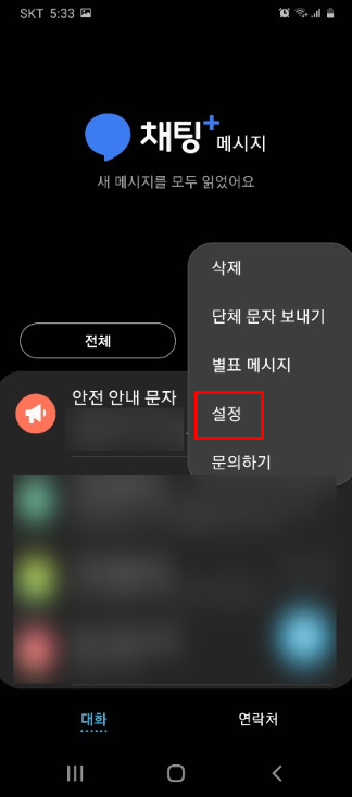 세로 점 세개 아이콘을 누르면 작은 창이 뜹니다. 삭제, 단체문자보내기, 별표메시지, 안심베시지, 설정, 문의하기 가 나옵니다. 이 중, 설정을 눌러주세요.