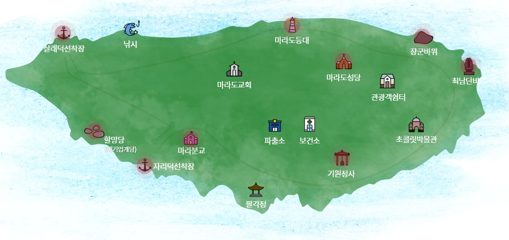 마라도의 형태는 고구마 모양으로 해안은 오랜 해풍으로 해식동굴과 기암절벽으로 이뤄져있고, 남쪽에는 한국 최남단 지역을 알리는 기념비가 있습니다. 섬의 가장 높은 곳에는 마라도 등대가 있습니다.