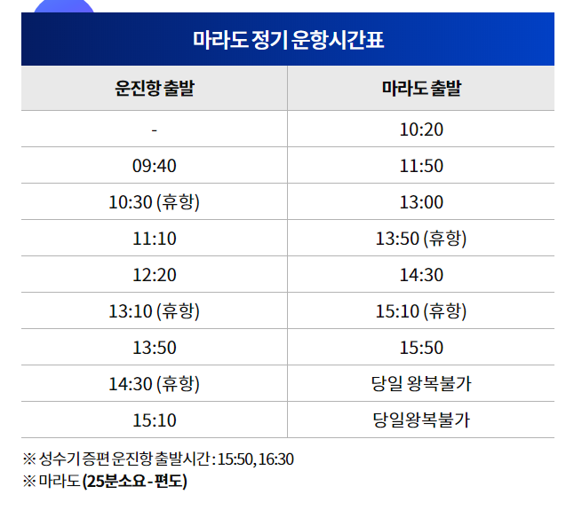 기상악화 또는 회사사정으로 운항시간이 변경될수 있습니다. 홈페이지에 들어가면 실시간 운항정보를 확인할 수 있습니다. 전화문의도 가능합니다. 문의 : 064-794-5490 상담시간 : 08:00~17:00
