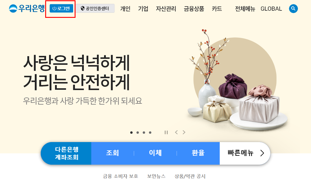 우리은행 사이트에 들어갔다면, 로그인을 해 주셔야합니다.