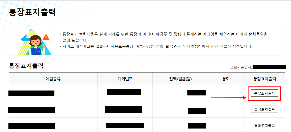 이 통장표지출력에서 전체계좌가 나열되어 있고, 오른쪽 끝에 통장표지출력이라는 버튼을 클릭해주면 됩니다.