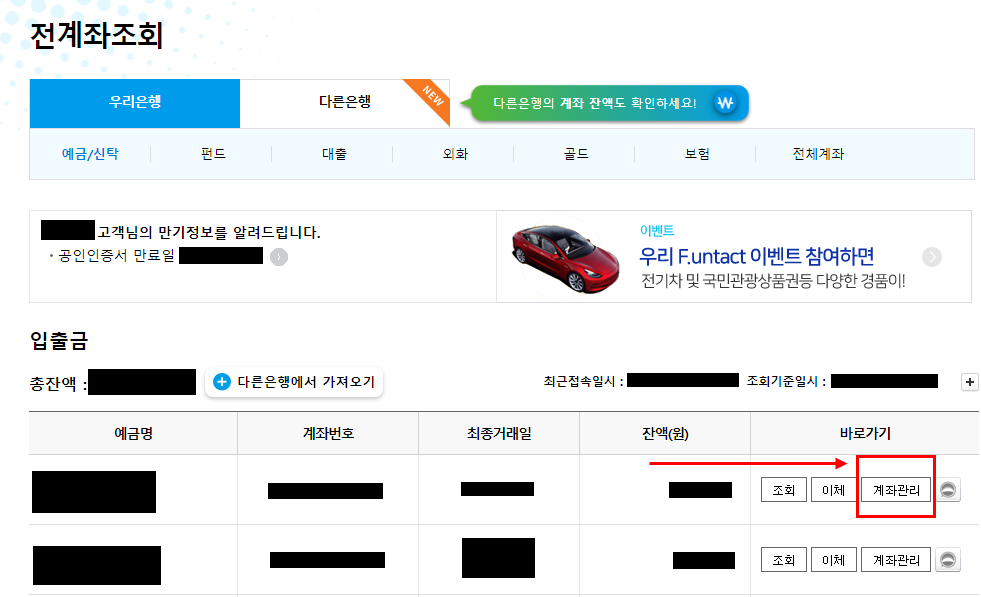 계좌들 중 원하는 계좌의 오른쪽 끝 계좌관리 메뉴를 클릭해줍니다.