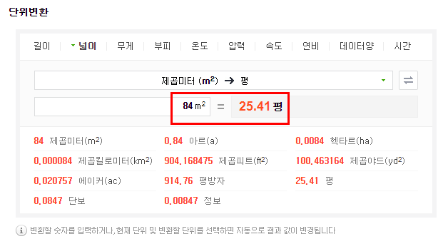 위 단위변환 표와같이 전용면적 84㎡ 는 25.41평입니다. 그리고 공급면적으로는 보통 32~33평형을 말합니다.