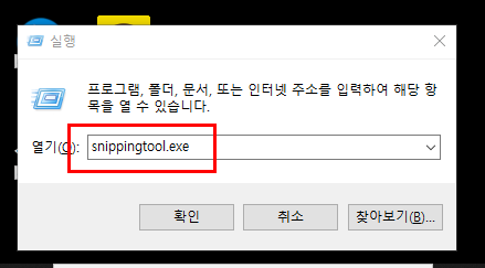 우선, 위 사진과같이 키보드에서 윈도우키+R 키를 눌러주시면 아래와 같은 실행창이 나옵니다. 이 실행창에 snippingtool.exe 라고 입력 후, 확인 버튼을 클릭해주세요.