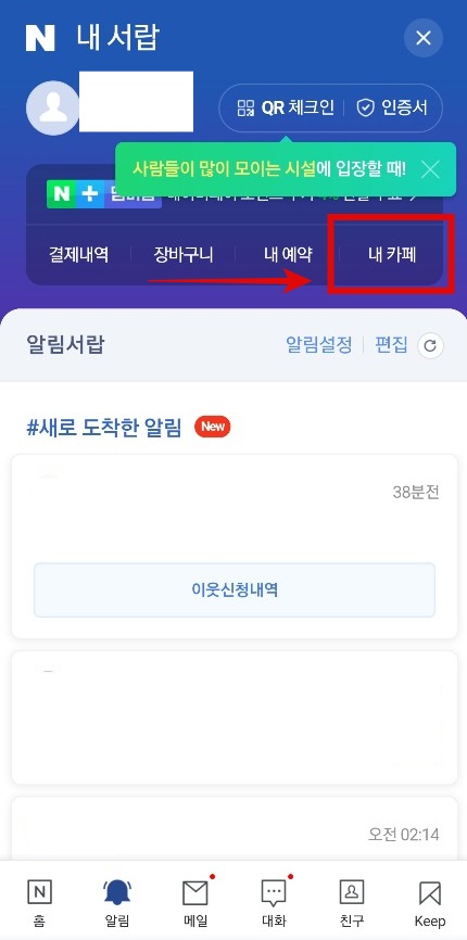 3. 그럼 내 서랍으로 화면이 바뀌고, [ 내 카페 ] 메뉴가 보입니다.