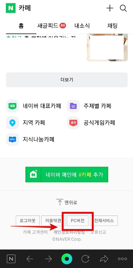 4. 그럼 자신이 가입한 카페 목록이 나옵니다. 제일 하단으로 스크롤해서 내려가주면 [PC버전] 이라는 메뉴가 보입니다. 이 PC 버전을 눌러 모바일버전에서 PC버전으로 바꿔줍니다.