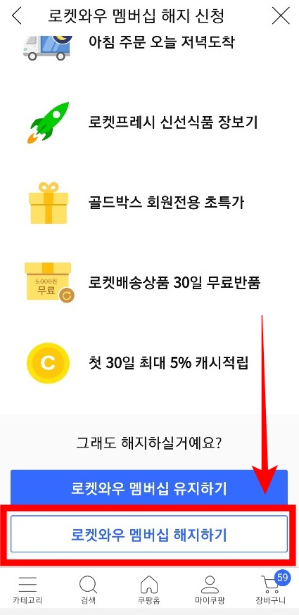 이 버튼을 누르면 [로켓와우 멤버십이 해지되었습니다.]라는 창이 뜨고, 확인을 눌러주시면 해지됩니다.