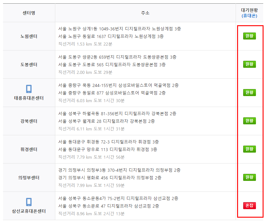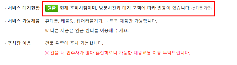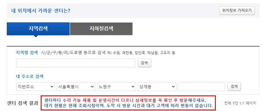 또한, 그 센터의 서비스 가능시간과 대기현황, 서비스 가능제품 및 찾아가는 방법이 자세히 안내되어나옵니다.