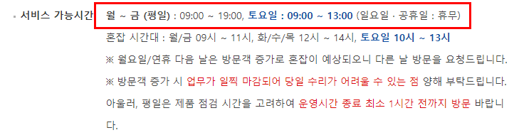 월 ~ 금 오전 9시 ~ 오후 7시까지 입니다. 토요일은 오전 9시 ~ 낮 1시까지 서비스가 가능하며,