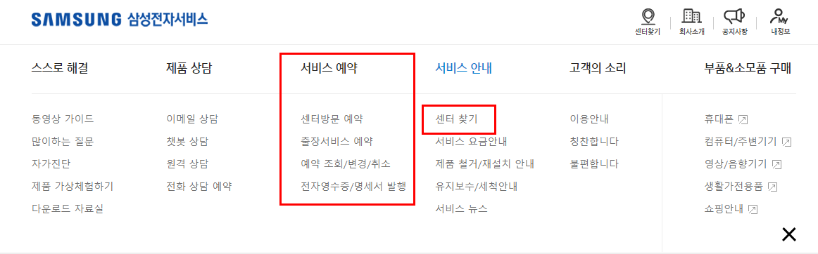 서비스안내 메뉴에서 하단에 보이는 센터 찾기에 들어가면 가까운 서비스센터를 찾아볼 수 있고, 이 곳에서도 센터방문 예약이 가능합니다.