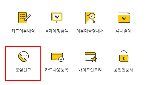 위와같이 홈페이지에 '분실신고' 메뉴가 있습니다. 이 메뉴를 통하여 분실한 카드를 신고해줍니다.