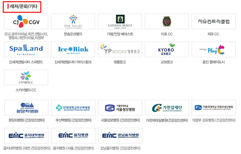 오프라인으로는 다양한 사용처가 있습니다. 쇼핑 / 외식 / 호텔 / 레져 / 문화/ 건강검진 으로 크게 나누어 볼 수 있습니다.