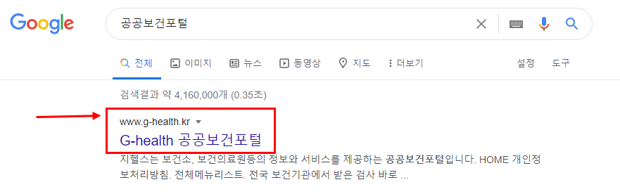 위와같이 공공보건포털을 입력하면 상단에 G-health 공공보건포털이 나오게됩니다.
