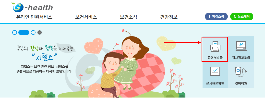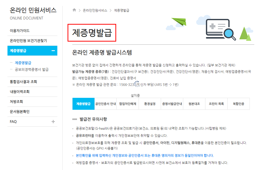 위 사진이 공공보건포털 메인 화면입니다. 우측상단을 보시면 [증명서발급]을 보실 수 있습니다.