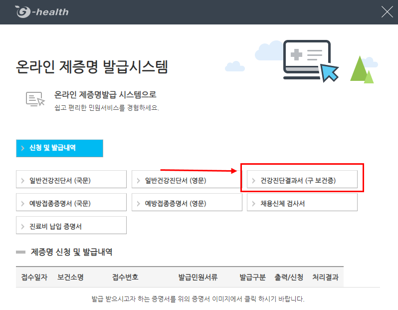 [증명서발급]을 클릭하면 [온라인 제증명 발급시스템]으로 넘어가게됩니다. 이 메뉴에서 보건증 뿐만아니라, 건강진단서 영문/국문, 채용신체 검사서, 예방접종증명서 국문/영문, 진료비 납입 증명서도 발급 받을 수 있습니다.