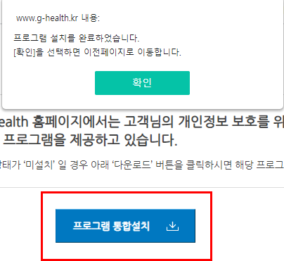기본적인 프로그램들을 설치해야해요. 필수 설치프로그램이 4가지 있습니다. 프로그램 통합설치를 누르고 기다리면 설치 완료 창이 뜹니다.