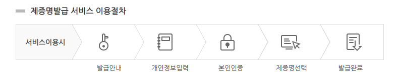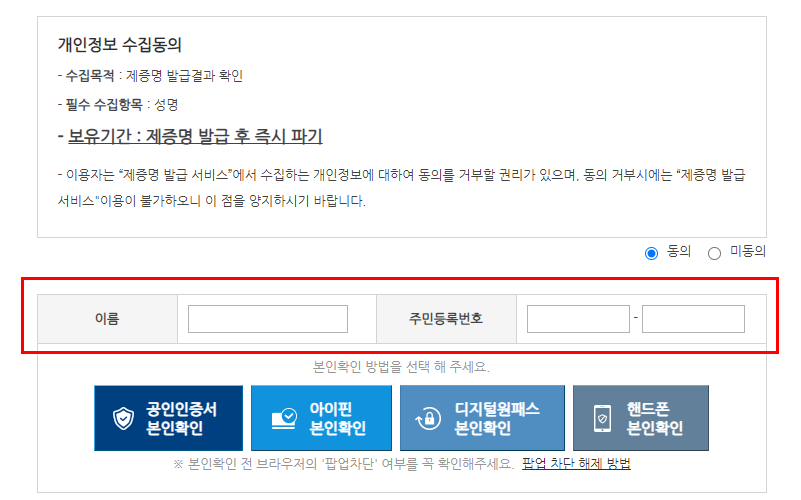 ※ 본인확인을 위해 공인인증서 또는 휴대폰 인증 과정을 거쳐야 발급 가능합니다.