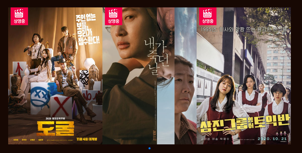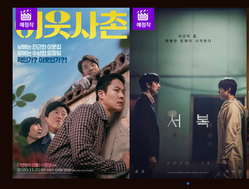 다음 상영 예정작이 미리 공개되어있습니다. 정우, 오달수, 김희원, 김병철 주연의 [이웃사촌] , 공유, 박보검 주연의 [서복]이 예정되어있습니다.