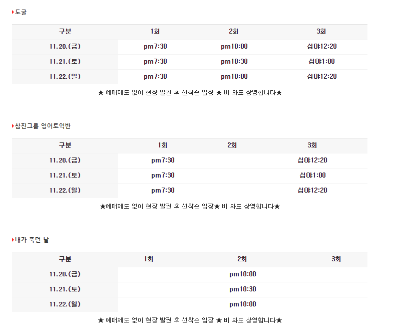 현재 홈페이지에 안내되어있는 상영시간표입니다.