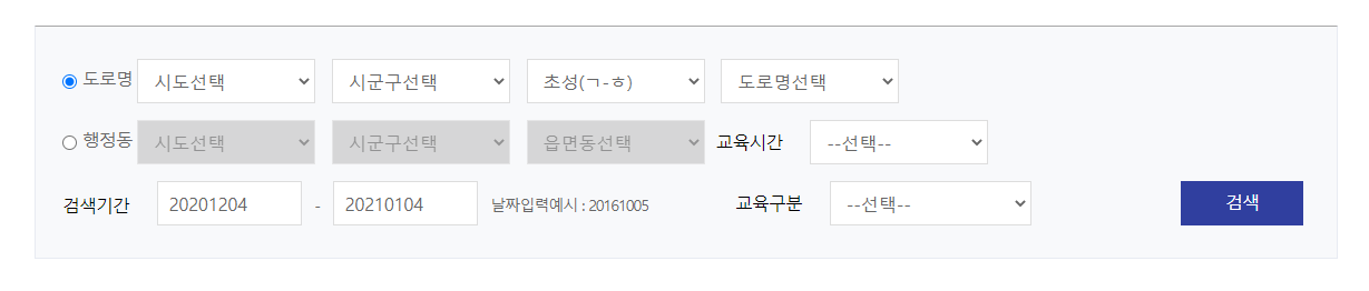 민방위 일정이 궁금하신분들은 해당 지역 및 검색기간, 교육구분(교육1년차, 교육1~4년차 ... ) 을 선택하시고 검색하면 됩니다.