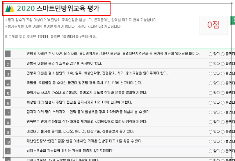 영상을 틀어놓고, 듣지 않는 경우가 많아 위와같이 교육평가가 생겼습니다. 평가 점수가 70점 이상이어야 민방위 교육인정을 받으므로 합격할 때까지 반복하여 평가지를 작성해야합니다.