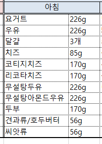 과일은 집에 있는 과일을 위주로 먹습니다. 사과, 배, 바나나는 한 조각이라는 규칙이있는데, 그 한 조각 크기가 애매해 170g이라 책에 적혀있는 수치를 기준으로 준비하곤합니다.