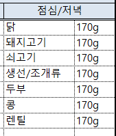 저녁식단은 단백질/채소170g/샐러드227g/지방 으로 구성되어있습니다.