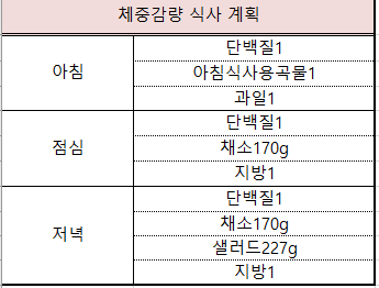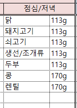 저녁식단은 단백질/채소170g/샐러드227g/지방 으로 구성되어있습니다.