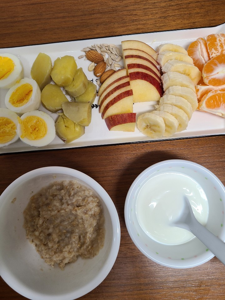 과일은 집에 있는 과일을 위주로 먹습니다. 사과, 배, 바나나는 한 조각이라는 규칙이있는데, 그 한 조각 크기가 애매해 170g이라 책에 적혀있는 수치를 기준으로 준비하곤합니다.