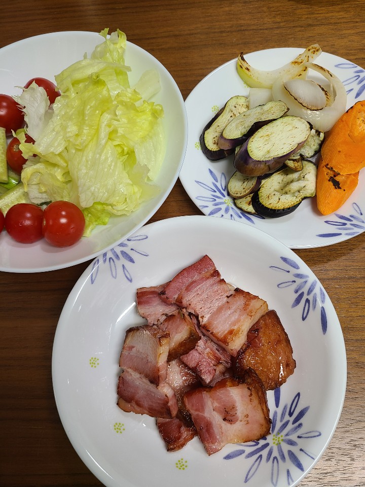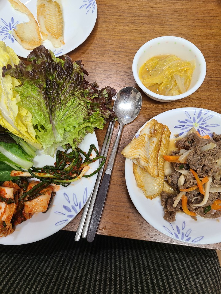 위 사진과 같이 저는 구운채소류, 샐러드 및 쌈채소, 김치로 채소와 샐러드를 구성하고, 돼지고기, 닭고기, 쇠고기 생선구이로 저녁 단백질을 채우고 있습니다.