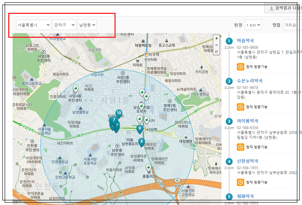 저는 서울특별시 / 관악구 / 남현동 을 선택해봤습니다.